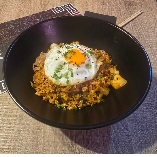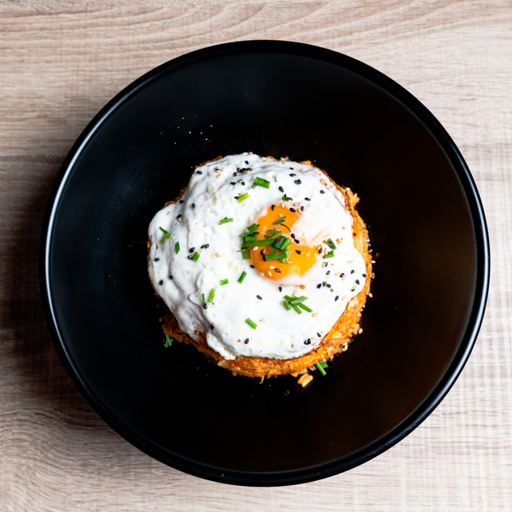 Nació como una receta de aprovechamiento, usando arroz del día anterior y kimchi maduro para crear una comida sabrosa en minutos. Nosotros solo aprovechamos el sabor y lo espectacular de este plato usando siempre ingredientes frescos!