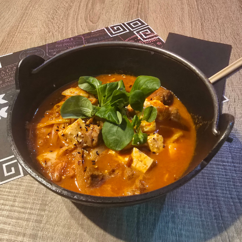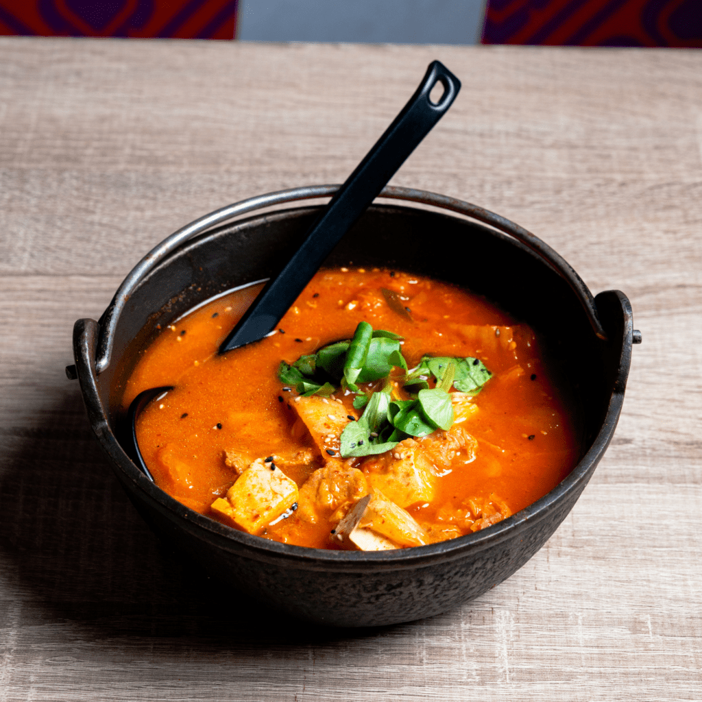 Su base, kimchi casero, cocinándolo con carne y tofu para obtener un caldo rico y sabroso.